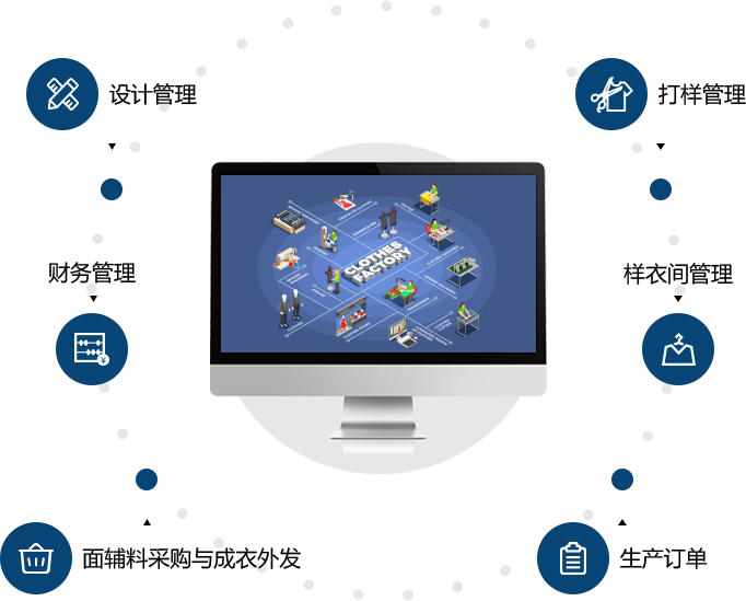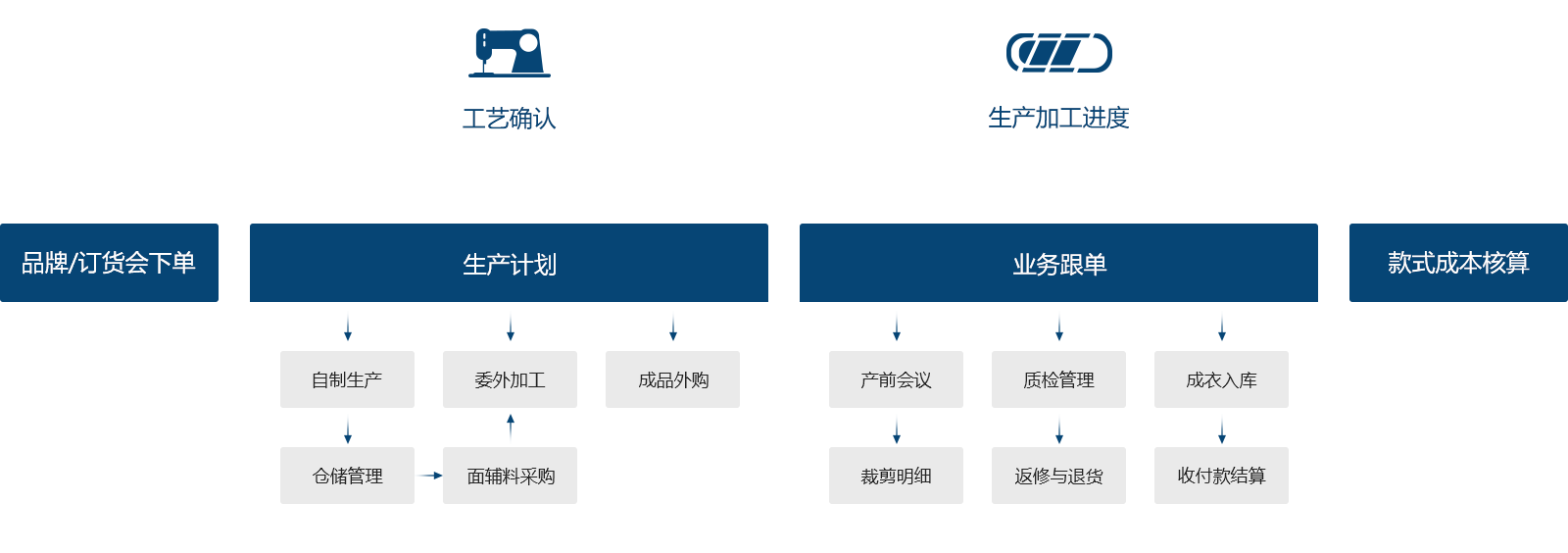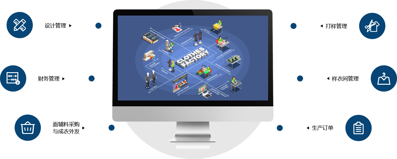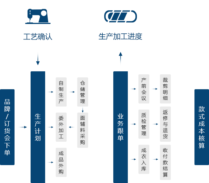 设计研发、供应链、生产与外发无缝集成,支持 精细化生产与零售以及财务ERP对接